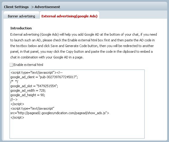 The panel will help you add Google AD at the bottom of your chat, if you need to launch such an AD, please check the Enable external html box first, paste the AD code in the textbox below and click Save and GenerateCode button, then you will be redirected to another panel, in that panel, you may click the Copy button and paste the code in the clipboard to embed a chat in combination with your Google AD in a page.