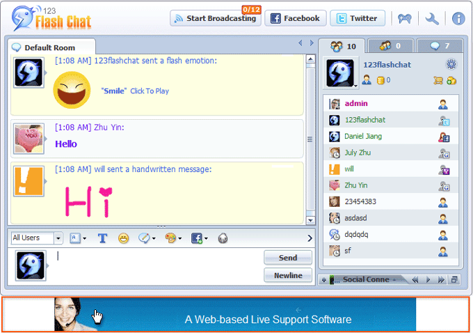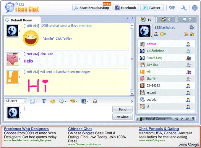 Google adsense code, graphic or even flash ads can be added to the chat room.
