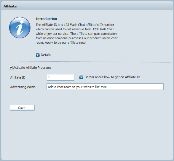 Affiliate is a newly-introduced feature which aims to help our clients get revenue while enjoying his 123 Flash Chat , as for the detailed information and operating steps, please click Details.