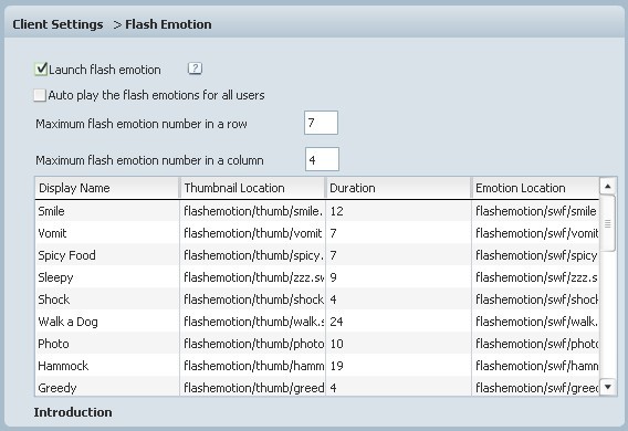 Here you can "launch flash emotion" by checking the item. Then you can use flash emotion in chat room. The name, quantity ,duration , location and thumbnail of flash emotion can be defined here.