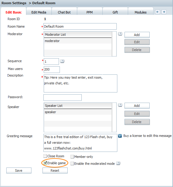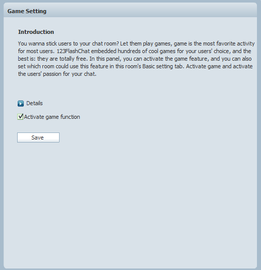 Game is the most exiting feature that 123FlashChat ever developed, and it is also a very helpful way to attract and stick more users for your chat. If you need to activate this feature, you can navigate to the Game Settings and check the Activate game function box.