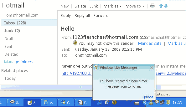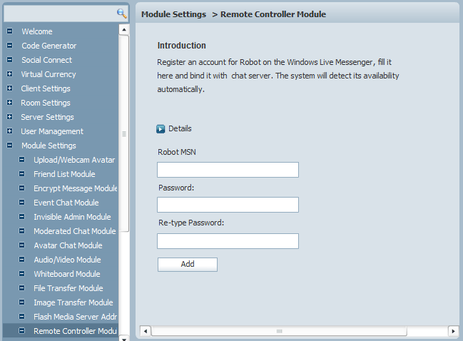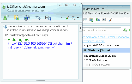 Wanna attract more users for your chat room? Try IM Friends Invitation Module. After activating the module, your user then could invited his MSN, Yahoo,GoogleTalk or Hotmail friends to join your chat, but before this actually happens, please fill in your advertising claim in Default Message box and select its send mode: Immediately will send your default massage via instant message, Email will send it via an email. Sending email may need the support of SMTP server, in default mode, we use the embedded SMTP server. But if you need to use outside SMTP server, you may configure this node: <mail-smtp-server ...> in this file: <123flashchat installation directory>/server/etc/fcserver.xml . mail-smtp-server->enable : this node decides whether you use outside SMTP server, On indicates Yes, off No.