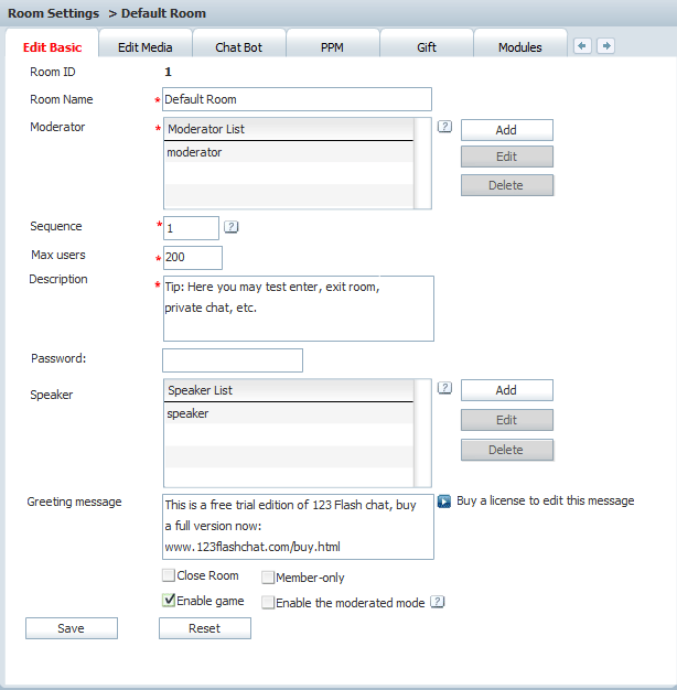 Now, you can make changes to the room in the tab ofEdit Basic, Edit Media, Event Chat, Avatar Chat, Chat Bot, Audio/Video and Whiteboard. You can do this referring to the operation of"Add".