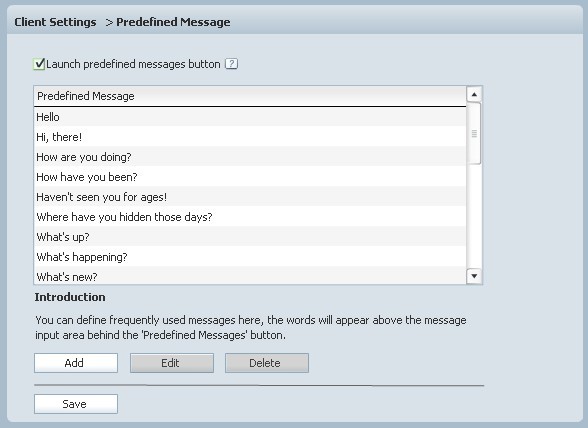 1. Enable Launch predefined message button.2. Click Add, input new message.3. Press Save button to finish setting.