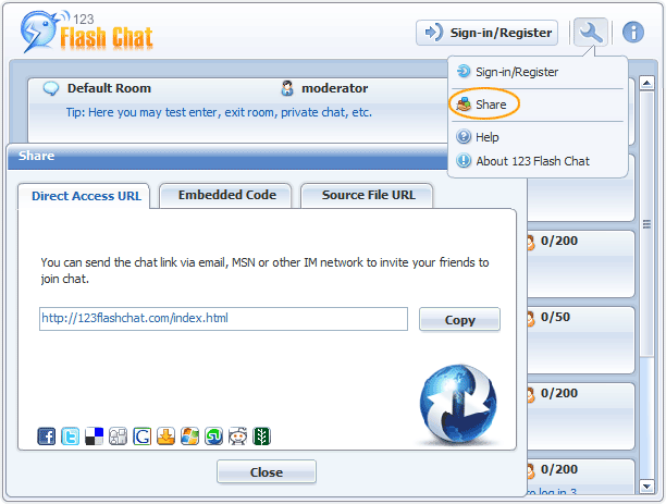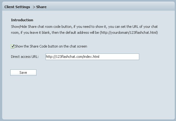 The panel is mainly used to manage the settings of Share functionality in the chat panel. If you need your users to use it to invite their friends to join your chat, please check the Show Share Code box to show it in the chat panel and enter the URL of your chat in the Direct access URL field.