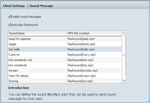Audio files (MP3 only) that used to send out sound messages can be defined here.