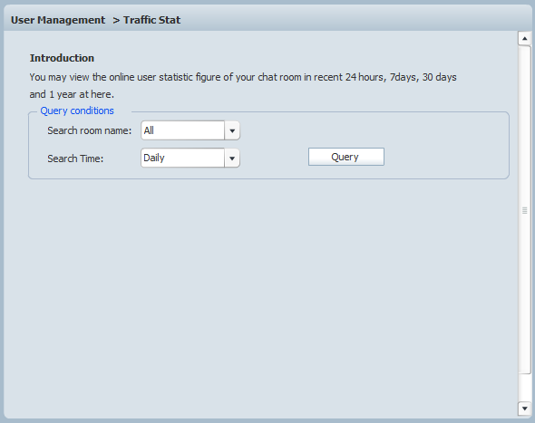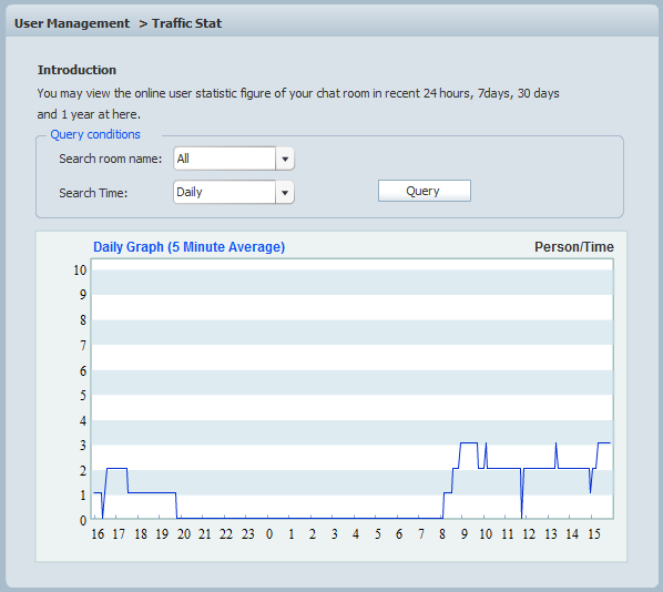 Traffic Stat is a newly-added feature of v7.2, which aims to assistant the administrator to learn about the traffic condition of his chat rooms in a more convenient way.