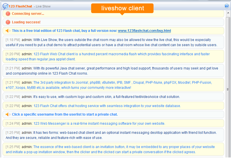 The Live Show is a pure HTML client, and it must be used together with the Flash chat client, because the previous one is a reader, and the latter one is the content provider.