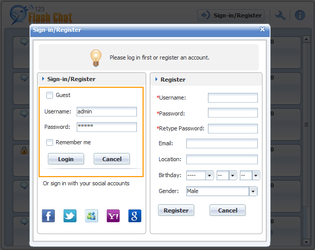1. Please enter "admin/admin" as username/password pair in Sign-in/Register Panel.