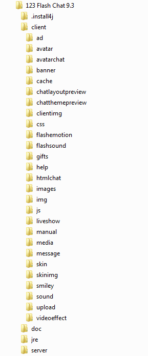 For operating systems other than Windows or Linux, before installing 123 Flash Chat Server, J2SDK5.0 must be installed(http://java.sun.com). The following folders are contained in 123FlashChat installation folder:
